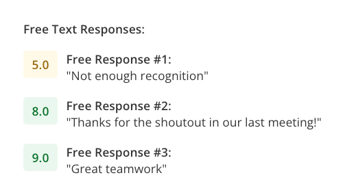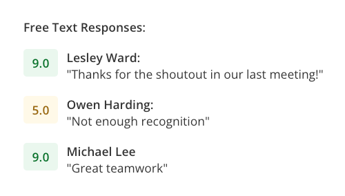 If the question has text responses, they will appear below the score breakdown. If you have permission to see respondent names, you’ll be able to see the respondent names for each text response.