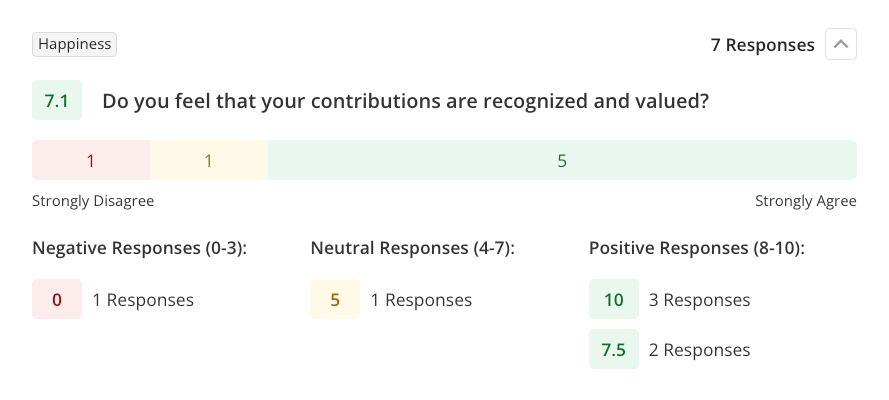 You can see the individual responses to questions on the Pulse Survey Responses page. This helps you understand how each question contributes to the overall score.